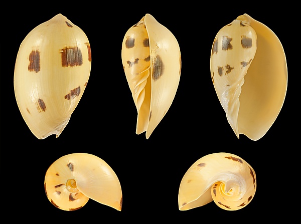 Раковина моллюска длиной 125—365 мм, большая, крепкая, конволютная, имеет овальную форму. Раковина имеет удлиненно- или расширенно-овальную форму, тонкостенная. Общая окраска раковины — дынно-жёлтая, иногда с имеющимися поперечными рядами коричневых пятен. Завиток является скрытым верхней частью наружной губы раковины моллюска. Высота всей раковины представлена исключительно последним оборотом. Наружная поверхность раковины гладкая, её скульптура образована исключительно частыми и тонкими линиями роста. Последний оборот сильно расширен. Устье раковины изнутри золотисто-кремового цвета, широкое, имеет овальную форму, расширенное или удлинённое. В нижней его части имеется глубокая вырезка полукруглой формы. Внутренняя губа имеет 3—4 резких колумеллярных зубца с глубокой выемкой между ними в нижней части. Сифональный вырост короткий с широким каналом. Наружная губа тонкая, плавно скруглённая[1][5].