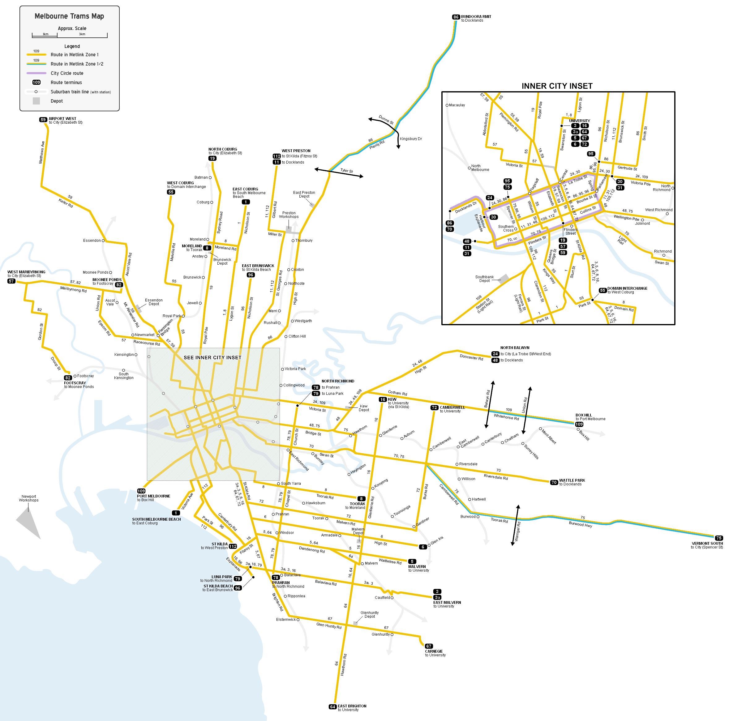 - № 3a — Мельбурнский Университет — Восточный Молверн через Сент-Килда-бич (маршрут выходного дня)