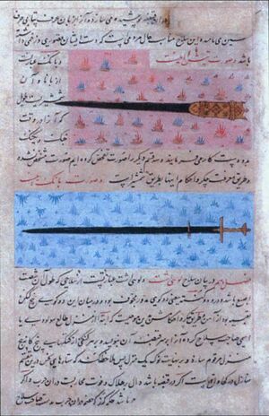 Впервые упоминается в трактатак XVI века «Ниханг-нама» и «Нуджум ал-Улум». Сохранилось несколько экземпляров подобных мечей. Один из них имеет общую длину 165 см и длину клинка — 118 см. Рукоять разделена на две части, каждая из которых снабжена чашевидной гардой. Клинок достаточно узкий, схож с клинком шпаги.