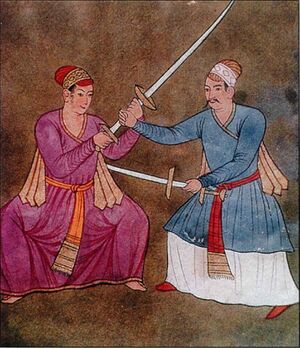 Обучение бою на мел путтах бемох. Иллюстрация из трактата «Ниханг-нама», Ахмеднагар, XVI век. |