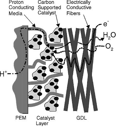 ПОМ зажата между двумя электродами, в которые встроен катализатор. Электроды (анод и катод соответственно) электрически изолированы друг от друга протонообменной мембраной. ПОМ обычно представляет собой проницаемый для протонов электрический изолирующий барьер из полимера перфторсульфоновой кислоты (ПФСК). (В настоящее время разрабатываются углеводородные варианты, которые, как ожидается, придут на смену ПФСК). Этот барьер позволяет протонам переходить от анода к катоду через мембрану, но заставляет электроны перемещаться по проводящему пути к катоду. Электроды прижимаются к ПОМ горячей прессовкой. Обычно используемые материалы для этих электродов - углеродная ткань или бумага из углеродного волокна.[3] Компания NuVant производит углеродную ткань под названием ELAT, которая максимизирует транспортировку газа к ПОM, а также отводит от мембраны водяной пар. Введение в ELAT катализатора из благородных металлов позволяет этой углеродной ткани также действовать как электрод. Существуют и другие технологи изготовления АОМ. Платина является одним из наиболее часто используемых катализаторов, однако используются и другие металлы платиновой группы. Рутений и платина часто используются вместе, если продуктом электрохимической реакции является окись углерода (CO), поскольку CO загрязняет ПОМ и влияет на эффективность топливного элемента. Из-за высокой стоимости этих и подобных материалов проводятся исследования по разработке катализаторов, в которых используются более дешевые материалы, поскольку высокая стоимость по-прежнему является препятствием для широкого экономического признания технологии топливных элементов. Текущий срок службы составляет 7300 часов в циклических условиях, при одновременном снижении нагрузки металла платиновой группы до 0,2 мг / см 2.[4]