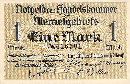 Нотгельды Мемельского края выпущены в 1922 году Торговой палатой Мемельского края с разрешения французской администрации Мемельланда (Верховного комиссара союзных вооружённых сил).