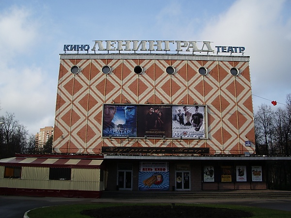 - Кинотеатр «Ленинград» расположен в восточной части парка. Здание было построено в 1959 году[98] по типовому проекту архитекторов Е. Гельмана, Ф. А. Новикова и И. А. Покровского. Облицовка здания красным и белым кирпичом образует сетчатый рисунок, напоминающий орнамент Дворца дожей в Венеции[99]. Кинотеатр имеет статус ценного градоформирующего объекта. В кинотеатре — один зрительный зал на 476 мест;[100] в фойе располагается кафе. В марте 2011 года кинотеатр был закрыт на неопределённое время[101]. В 2013 году появились планы сноса кинотеатра и строительства на его месте торгово-развлекательного комплекса. При этом планировалось увеличить площадь здания с 2625 м² до 5600 м² и устроить подземную парковку[102]. В августе 2014 года стало известно, что этот проект отменён[67].