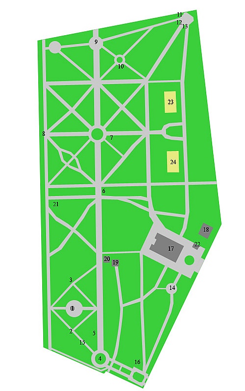 Если на карте 1818 года показана прямоугольная планировка парка, то на плане императорских дворцов такую планировку имеет лишь южная его часть. Планировка северной части сада стала диагональной. Такое расположение дорожек сохранилось до наших дней[11].