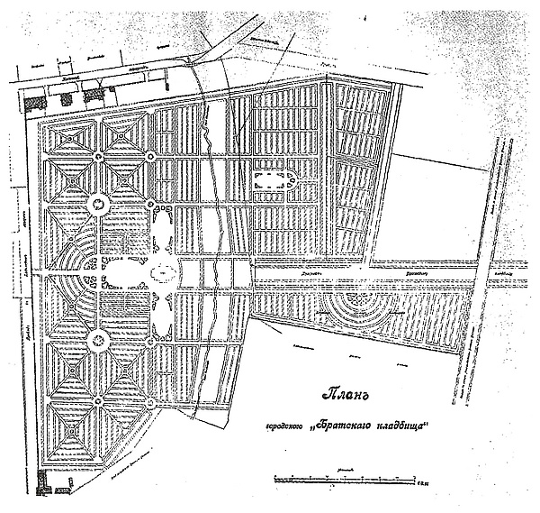 Сразу после покупки участка начались работы по планировке Братского кладбища, которыми занялся инженер С. С. Шестаков. Он посещал Лесное кладбище в Риге и Братское кладбище в Севастополе, чтобы ознакомиться с их устройством. По мнению Шестакова, кладбище «должно было получить особое устройство, соответствующее его специальному назначению»[10]. Братское кладбище принципиально отличалось от традиционных некрополей большим количеством деревьев, между которыми располагались могилы[19]. В основу композиции кладбища легла система диагональных дорожек усадебного сада. В центральной части был запланирован зелёный открытый партер с концентрически расположенными вокруг предполагаемого храма рядами могил[20] (позднее храм решено было возвести в другом месте)[21].