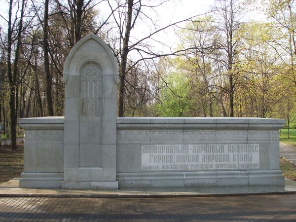 - Стела «Мемориально-парковый комплекс героев Первой мировой войны» установлена у главного входа в парк со стороны метро «Сокол». Представляет собой стену из светло-серого камня[83]. В левой части — обелиск с изображённым на нём православным крестом. На стене крупным шрифтом нанесена надпись: «Мемориально-парковый комплекс героев Первой мировой войны Бывшее Московское городское Братское кладбище».