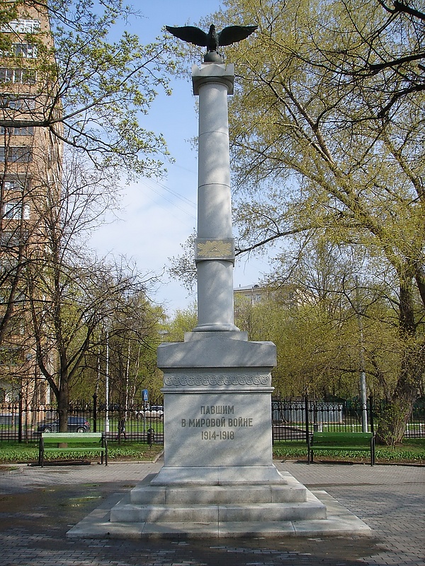 - Обелиск «Павшим в Мировой войне 1914—1918 годов» установлен у северной границы парка. Он завершает перспективу центральной аллеи. Обелиск состоит из массивного основания, на котором стоит колонна. На вершине колонны — парящий бронзовый сокол. В центральной части колонны находится небольшой прямоугольный выступ, на котором золотой краской начерчен символ — «Всевидящее Око». На основание памятника нанесена надпись: «Павшим в Мировой войне 1914—1918 годов»[83]. Автор скульптурной части памятника — А. А. Пирогов[84].