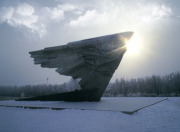 Создан в память погибшим летчикам-испытателям. Если взглянуть на мемориал с высоты птичьего полёта, то в мраморных плитах угадываются кресты.