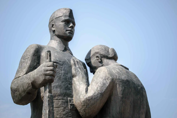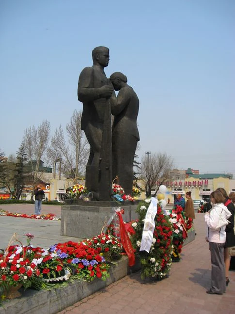 Композиционным центром ансамбля является скульптурная группа «Прощание», изображающая воина-красноармейца и мать, провожающую его на фронт. Двухфигурная композиция отражает исторические реалии военного времени, когда с Привокзальной площади отправлялись на фронт жители города. Скульптурная группа отлита из бронзы на Мытищинском заводе художественного литья. Автор композиции — скульптор П. Л. Миронов.