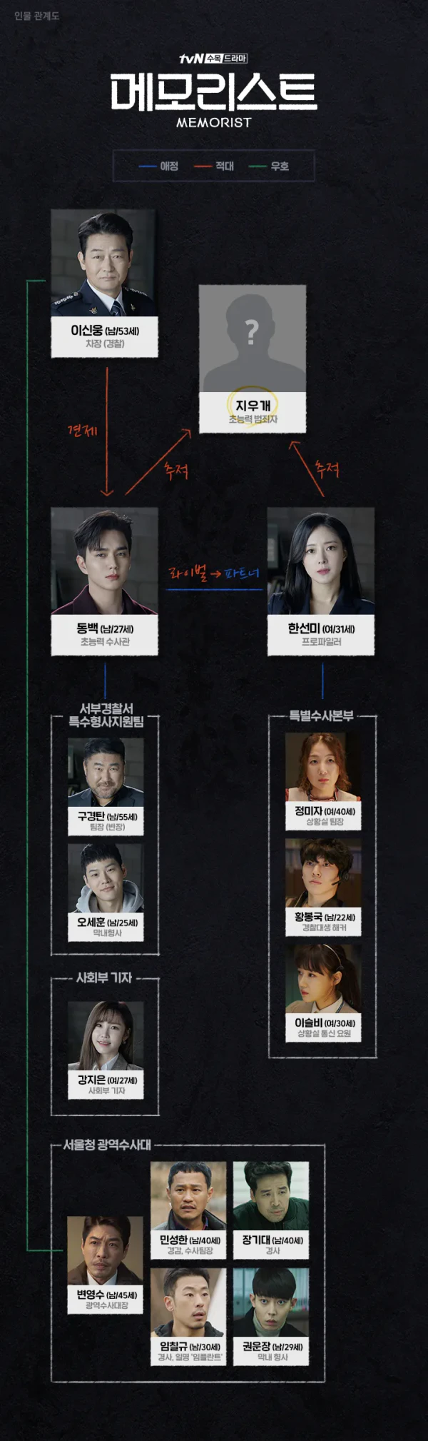 - Ли Се Ён в роли Хан Сун Ми/Ким Со Ми[11] — самая молодая женщина-профейлер Управления специальных расследований. Изначально была юристом, но позже стала офицером полиции, чтобы выяснить правду об убийстве своего отца, которое произошло 20 лет назад. Он был лидером профсоюза, но предал работников, которых должен был защищать, что привело к массовым увольнениям.