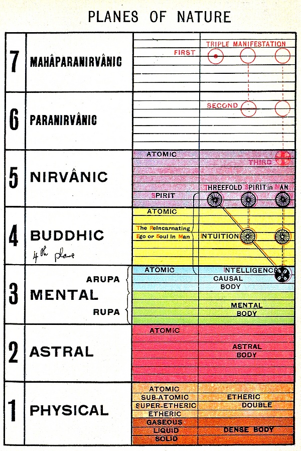Согласно представлениям Ледбитера и других теософов, мир, в котором мы живём, состоит из семи «планов».[K 5] И хотя сознание человека ограничено низшим физическим планом, он «функционирует» также и на других планах, для чего ему служат соответствующие «тела». Именно поэтому он может «путешествовать», например, в своём астральном теле по астральному плану, а в ментальном теле — по ментальному. Для большинства людей такой опыт имеет место во время сна, но, как правило, не запоминается; для ясновидца же и оккультиста он доступен в любое время и не забывается. По утверждению Ледбитера, он в течение года в Индии развивал свои оккультные способности под руководством опытных наставников.[7]
