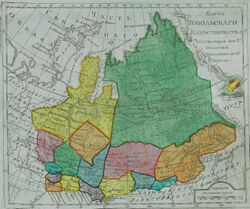 Карта Тобольского наместничества 1796 года. Берёзовский уезд находится в верхней левой части (выделен жёлтым цветом)