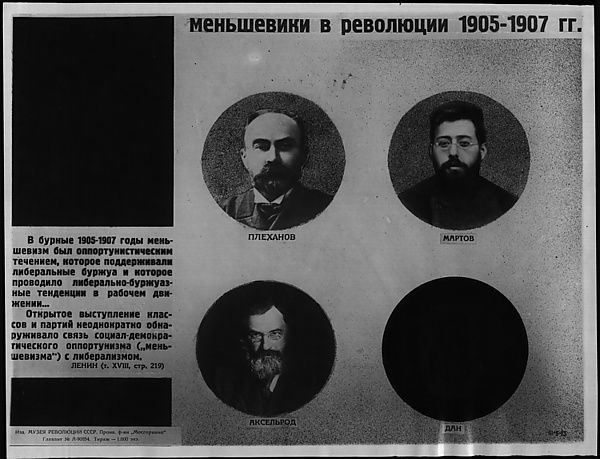 «Меньшевики́» — умеренное крыло Российской социал-демократической рабочей партии, с 24 апреля 1917 — самостоятельная Российская социал-демократическая рабочая партия. Лидеры: Ю. О. Мартов, А. С. Мартынов, П. Б. Аксельрод, Г. В. Плеханов, Ф. И. Дан, И. Г. Церетели[1].