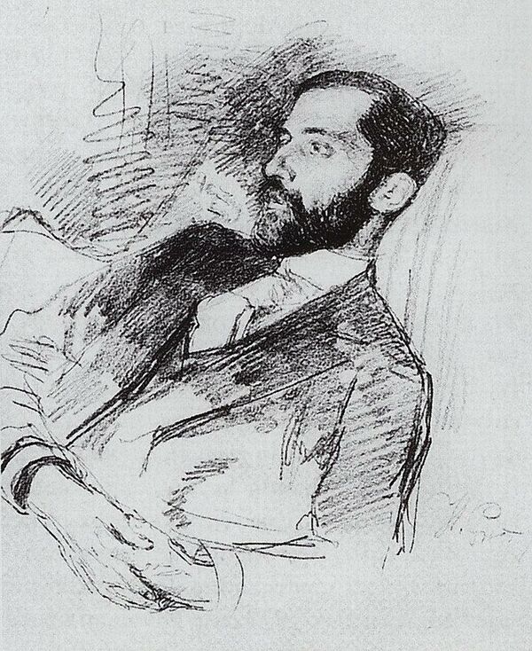 Если бы два года тому назад вы прошли около часу в Летний сад в Петербурге, вы встретили бы его, маленького человека с бледным, белым лицом и большими, брошенными вдаль глазами… Он прямой как палка, в пальто с бобровым воротником, в меховой шапке. Высокое его с густой, из щёк растущей каштановой бородкой лицо: оно ни в чём не может остановиться. Он в думах, в пурговом хохоте, в нежном, снежном дыме. Мимо, мимо проплывал его силуэт, силуэт задумчивого лица с широко раскрытыми глазами — не слепца: всё он видит, все мелочи заметит, со всего соберёт мёд мудрости… Его лицо тоже символ. Вот он проходит — подойдите к нему, взгляните: и восковое это, холодное это лицо, мёртвое, просияет на мгновение печатью внутренней жизненности, потому что и в едва уловимых морщинах вокруг глаз, и в изгибе рта, и в спокойных глазах — озарение скрытым пламенем бешеных восторгов; у него два лица: и одно, как пепел; и другое, как осиянная, духом сгорающая свеча. Но на истинный лик его усталость мертвенная легла трудом и заботой. Отойдите — и вот опять маска. И нет на ней печати неуловимых восторгов неугасимых… Если бы мы подошли к нему здесь, в Летнем саду, посмотрел бы на нас он холодным, неприязненным взором, поклонился бы сухо, сухо[22]. — А. Белый. Арабески. Мережковский. Силуэт.