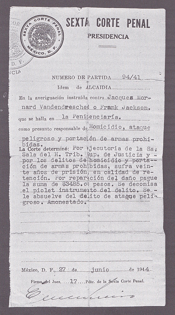 Длительное время содержался в полицейских тюрьмах, непрерывно подвергаясь избиениям и пыткам. В марте 1941 года Меркадера перевели в городскую тюрьму, где условия содержания были мягче. Мексиканский суд приговорил его под именем Жака Морнара к 20 годам лишения свободы, максимальному наказанию по закону. Рамон Меркадер полностью отбыл срок заключения, был освобождён 6 мая 1960 года и доставлен на Кубу, а затем тайно переправлен пароходом в СССР.
