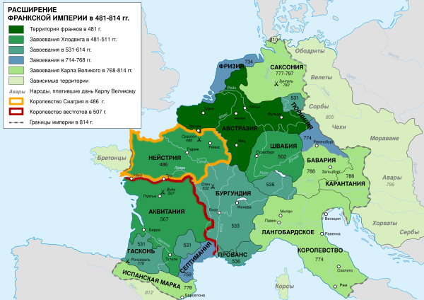 В 558 году вся Галлия объединилась под властью Хлотаря I, владевшего ею до своей смерти в 561 году. Но и у него было четыре наследника, что привело к новому дроблению государства на три части — Бургундию (на востоке Франкского королевства, на территории бывшего государства бургундов), Австразию (на северо-востоке Галлии, в том числе исконные земли франков по берегам Рейна и Мааса) и Нейстрию (на северо-западе с центром в Париже). На юго-западе располагалась Аквитания, которая считалась общей территорией всех трёх франкских королей.