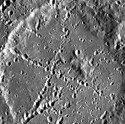 6 октября 2008 года зонд «Мессенджер» совершил второй пролёт в непосредственной близости от Меркурия. В ходе пролёта были получены снимки Меркурия, на которых обнаружились непонятные области тёмного вещества, обильно разбросанные по его поверхности. Они намного темнее фона и, судя по всему, представляют собой «выбоины», оставленные метеоритными ударами. Однако не все кратеры даже одинаковой глубины демонстрируют на дне материал одинаковой структуры — это говорит о том, что распределение вещества под поверхностью планеты неоднородно. Самая малая планета геологически оказалась не так-то проста, и её структура не представляет собой элементарный «бутерброд»[источник не указан 3057 дней].