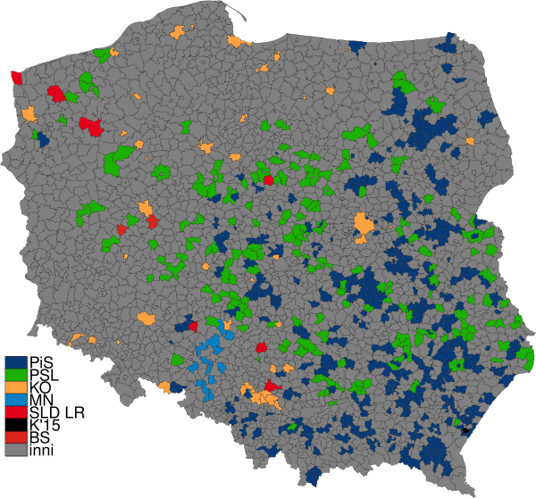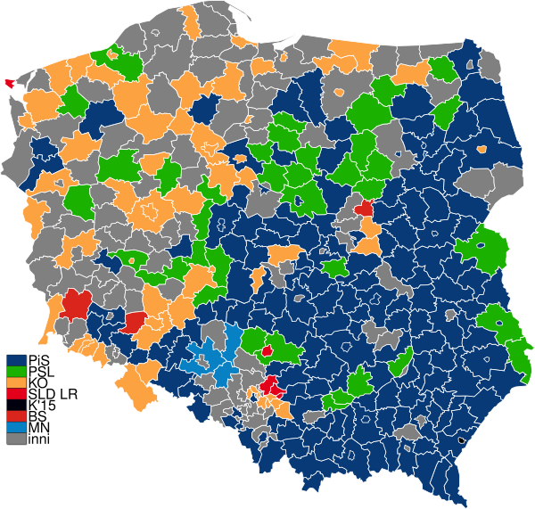 | Право и Справедливость | Гражданская коалиция | Польская народная партия | SLD | Кукиз'15 | Беспартийные активисты местного самоуправления | КОРВИН | Левые вместе | Национальное движение | Зелёные | Региональные партии | Другое | |