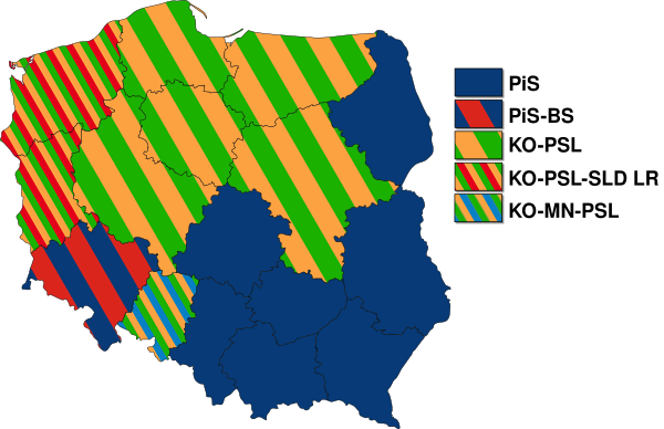| Сеймик Варминьско-Мазурского воеводства[17] | 28,15 | 30,40 | 19,64 | 8,16 | 6,29 | 0,79 | 0,48 | 2,31 | 2,65 | 0,45 | — | 0,70 |