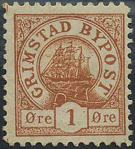 Местная почта в Гримстаде была основана Николаем Херлофсоном (Nicolai B. Herlofson) 15 января 1887 года. Серия из пяти марок местной почты, отпечатанные литографским способом на белой бумаге, с надписью «Grimstad Bypost» и изображением трёхмачтового судна в круге, вышли в день открытия почты. Марки гасились круглым штемпелем с надписью «Grimstad-Bypost» по окружности и восьмиконечной звездой внизу, а также переводной календарной датой и временем отправления в четыре строки в центре. Местная почта в Гримстаде закрылась в конце 1887 года.[12][13]