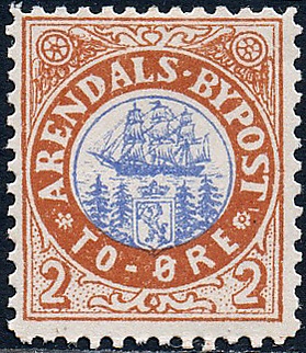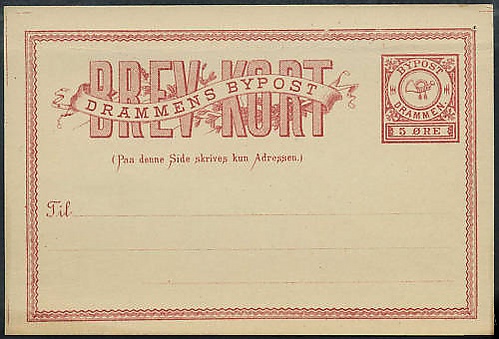 3. В 1875 году местная почта, основанная годом ранее неким Экхольдтом, выпустила марку номиналом в 2 скиллинга. Марка представляет собой ручной оттиск синей или матово-синей краской на белой бумаге надписи «By / Drammen / Post» и номинала «2ß» в рамке. Известны марки с перфорацией, выполненной на швейной машине. Эта почта закрылась в 1876 году.[15]