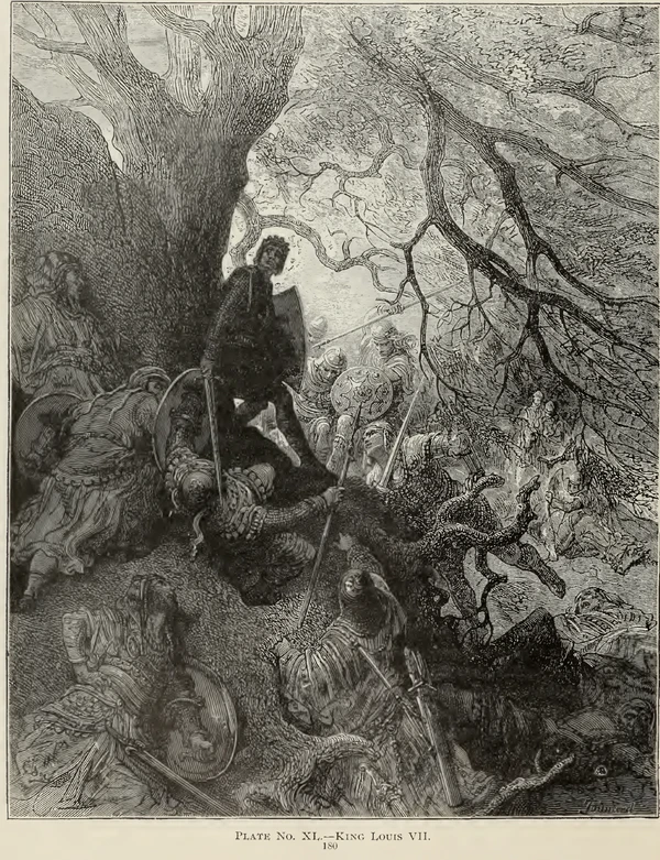 Источники приводят различные данные о численности армии Людовика: Михаил Сириец — 5000 человек; Бар-Эбрей — 50 000 всадников и бесчисленное множество пеших. Ибн аль-Каланиси называл 1 000 000, но, вероятно, в это число он включал и армию Конрада. Невозможно точно оценить размер армии Людовика, но, вероятно, она была меньше армии Конрада[91]. Получив в Никее известие о поражении Конрада, Людовик предпочёл выбрать более безопасную дорогу[30]. Он направился к южному побережью Анатолии более западным путём, следуя прибрежной дорогой, контролируемой Византией[92]. Однако близ Эфеса крестоносцы подверглись нападению сельджуков[92]. В пути французы натыкались на разлагающиеся тела немецких крестоносцев. Одон Дейльский отмечал, что французская армия пострадала из-за запаха и заразы[93].