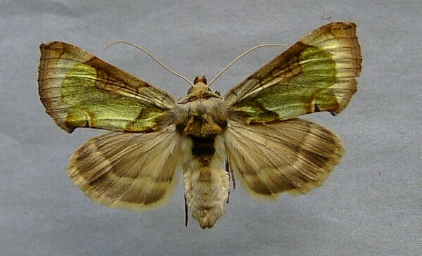 Средних размеров бабочка. Длина переднего крыла 16—19 мм. Размах крыльев 32—42 мм. Основной фон передних крыльев медно-зеленый, с голубоватым оттенком и сильно выраженным металлическим отливом. Передний и внешний края серого цвета с розовато-жёлтым оттенком. Поперечные полосы на крыльях светло-бурого цвета, выражены довольно слабо. Ближе к переднему краю крыла располагаются три светло-бурых пятна, каждое из которых очерчено тёмно-бурым. Окраска задних крыльев светло-бурая с лёгко выраженным затемнением по краю, такой же волнистой тонкой полосой ближе к центру и светлой бахромкой. Голова желтовато-серого цвета, грудь серая с зеленоватым оттенком. Брюшко желтовато-серого цвета с коричневыми пучками волосков на 2 и 3 сегментах.