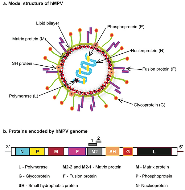 Вирусная РНК кодирует 9 белков[5]. Вид похож на респираторно-синцитиальный вирус человека, сходство аминокислотных последовательностей составляет 23−43%[5].