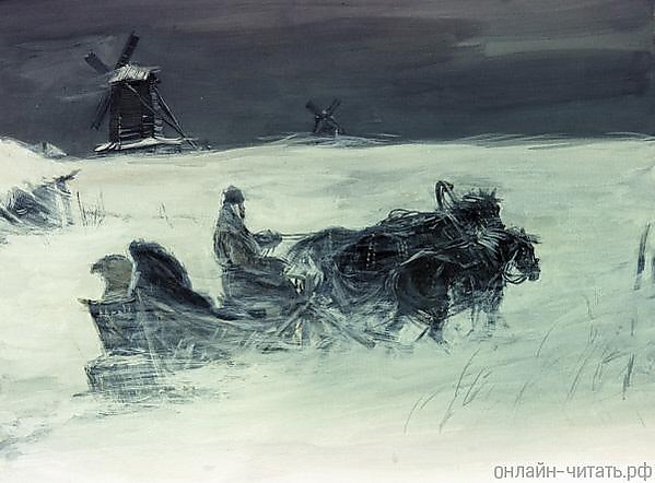 Какое-то время колея была видна, но потом начала пропадать и вскоре совсем исчезла. Ямщик и пассажиры уже не могли понять, в правильном ли направлении они движутся. Рассказчик вышел поискать дорогу, но тут же в метели потерял из виду сани. Они снова решили ехать назад. Но когда увидели те же курьерские тройки, едущие по той же дороге в нужную им сторону, решили последовать за ними. Неловко развернувшись, ямщик задел оглоблей привязанных лошадей, и несколько из них убежали. Старый ямщик с тройки (Митрич) стал ругать ямщика рассказчика и потом вместе с другим ямщиком по имени Василий они отправились в погоню за лошадьми.