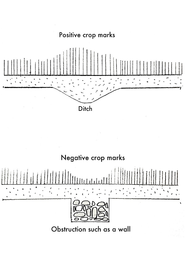 - Следы от посевов: зарытые канавы будут удерживать больше воды, а зарытые стены — меньше, чем нетронутая земля, что приводит к росту или уменьшению высоты посевов, и, следовательно, определяет зарытые особенности, например, как тональные или цветовые различия.