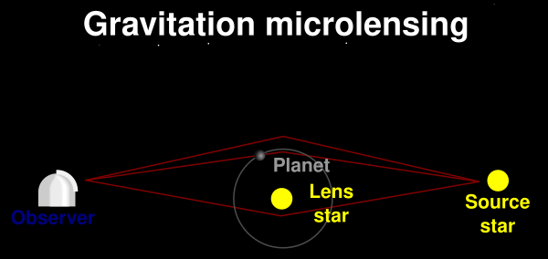 Гравитационное микролинзирование возникает в том случае, когда гравитационное поле более близкой звезды увеличивает свет от далёкой звезды, действуя при этом как линза. Если при этом звезда переднего плана имеет планету, то собственное гравитационное поле планеты может внести заметный вклад в эффект линзирования. Недостаток данного метода заключается в том, что эффект появляется только в том случае, когда две звезды точно выровнены вдоль прямой. Также проблемой является тот факт, что события линзирования коротки и длятся всего несколько дней или недель, поскольку дальняя звезда, ближняя звезда и Земля непрерывно движутся относительно друг друга. Однако, несмотря на это, учёные зафиксировали более тысячи таких событий в течение последних десяти лет. Этот метод является наиболее продуктивным для поиска планет, находящихся между Землёй и центром галактики, так как в галактическом центре находится большое количество фоновых звёзд.
