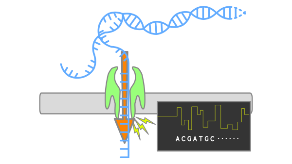 Метод основан на измерении тока ионов через единичную нанопору в непроводящей мембране. При прохождении через эту пору нуклеотидов ток падает. Время, на которое изменяется ток ионов, и величина этого падения зависят от того, какой нуклеотид в данный момент находится внутри поры[27].