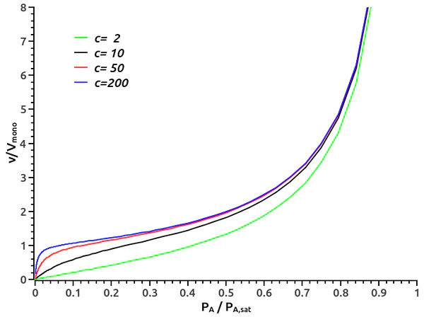 где — отношение давления в системе к давлению конденсации, — величина адсорбции, — объем монослоя на поверхности адсорбента, C — отношение констант адсорбционного равновесия в первом слое и константы конденсации.