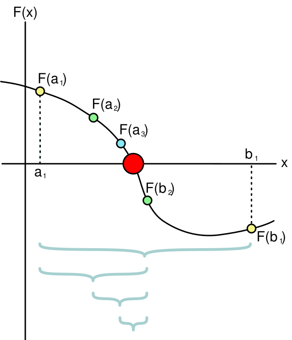 - Иначе или, в действительных вычислениях, , то разобьём отрезок на два равных отрезка: и .