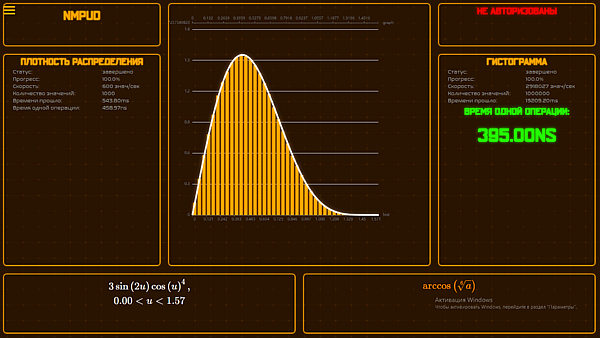 Моделирующая формула (алгоритм) демонстрируется (или заносится) внизу в правой части основной страницы системы. Система с помощью многократного обращения к формуле строит гистограмму, которая отображается в центре страницы желтыми столбиками; этот процесс можно наблюдать поэтапно. Правильность моделирующей формулы определяется визуальной близостью построенной гистограммы и графика плотности .