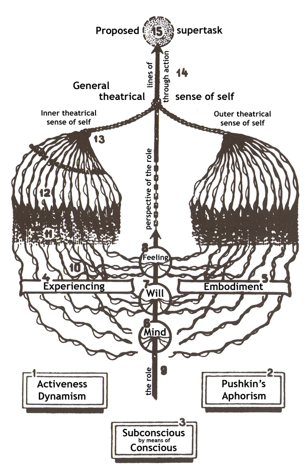 «Система» основана на том, что Станиславский называл «искусством переживания», которое он противопоставлял «искусству представления»[5]. Этот приём заключается в использовании сознательной мысли и воли актёра для того, чтобы мобилизовать подсознательные психологические процессы, такие как эмоциональные переживания и подсознательное поведение[6]. На репетиции актёр ищет внутренние мотивы для оправдания действий персонажа (т. н. «задача»).[7] Впоследствии Станиславский развил свою систему, внеся в репетиционный процесс «метод физических действий»[7]. Вместо обсуждения деталей роли он добивался так называемого активного анализа, состоявшего в импровизации сценических ситуаций[8]. По выражению Станиславского, «лучший анализ пьесы есть действия в предлагаемых обстоятельствах»[9].