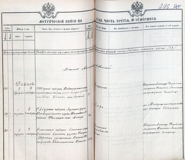 - «О умерших». Оригинальный раздел третьей части содержит номер, дату смерти и дату погребения, сведения о месте жительства умершего, его сословном и владельческом положении, имени, фамилии, отчестве, возрасте и причине смерти, месте захоронения (для несовершеннолетнего — имя, возраст, а также сведения о месте жительства, сословном и владельческом положении, имени, фамилии и отчестве отца). Здесь указывалось кто из священно- и церковнослужителей совершал погребение, и священник, исповедавший и приобщивший умершего накануне смерти.
