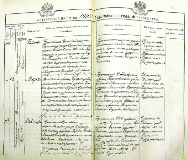 - «О родившихся». Помимо порядкового номера в первой части указывались дата рождения и крещения, пол новорождённого и данное ему имя. Место жительства, сословная принадлежность, если это крепостной, то владельческая принадлежность (например, какому помещику принадлежали), вероисповедание, национальность, имя, фамилия, отчество отца и матери (или указывалось на незаконность рождения). Записывались крёстные родители (восприемники), их местожительство, сословная и все остальные сведения. Указывалось, кто из священно- и церковнослужителей крестил ребёнка и где этот обряд происходил — в доме прихожанина или в церкви.