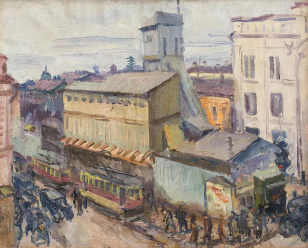 На полотне представлен городской пейзаж: на первом плане изображена дорога с идущими людьми, справа от которых расположена группа автомобилей, а слева движутся трамваи. Второй план занимает застройка и деревянная башня строящегося метро, справа размещён светофор. Над городом проходит неширокая полоса светлого неба. Картина выполнена в преобладающих сиреневато-серых оттенках цветовой гаммы, что подчёркивает атмосферу повседневной городской жизни, характерной для бытового жанра.