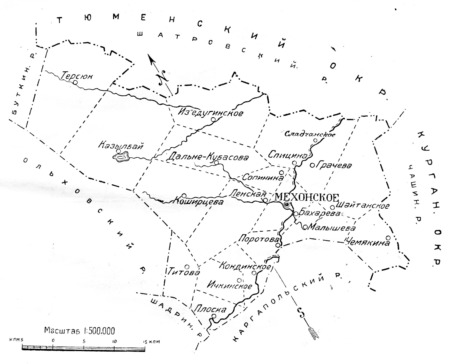 Мехонский район был образован в составе Шадринского округа Уральской области в ноябре 1923 года. В состав района вошли сельсоветы Бахаревский, Грачевский, Дальнекубасовский, Изъедугинский, Ичкинский, Каширцевский, Кондинский, Кызылбаевский, Ленский, Малышевский, Мехонский, Плоскинский, Поротовский, Спицынский, Терсюкский, Чемякинский и Шайтанский.