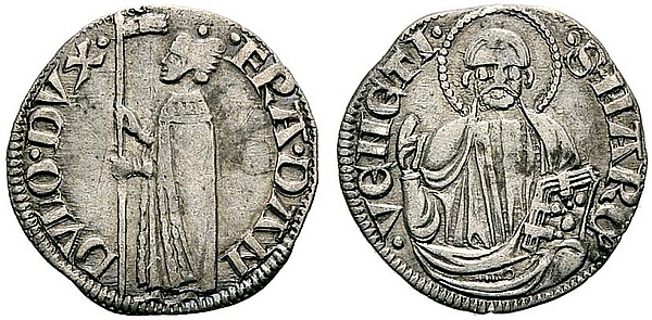 Во время правления Андреа Дандоло (1342—1354) были отчеканены меццанино номиналом в ½ сольдо[3] с весьма характерным изображением. На аверсе монеты было помещено изображение дожа получающего меч из рук апостола Марка. На дукатах и матапанах руководитель Венецианской республики получает знамя, а не клинок. В 1348 году город пережил эпидемию чумы, которая привела к гибели 50—60 % населения. Сам Андреа Дандоло всё время находился в городе и боролся с последствиями болезни. Меч на монете явился символом того, что с помощью высших сил дож получил оружие и одержал победу над чумой[4]. На реверсе меццанино впервые среди всех венецианских монет появилось изображение воскресшего и покидающего гробницу Иисуса Христа. Это, по всей видимости, стало символом того, что город восстанет в былом величии после страшной эпидемии[4].