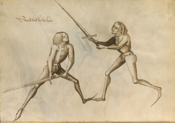 Также из фолиантов XV века[34] вытекает, что схема боя тех времён основывалась на технике и скорости, но никак не исключительно на грубой физической силе. В эпоху пластинчатых доспехов обычно применялись уколы по слабым местам доспеха, а рубящие удары имели место, только когда противник был без доспехов. Битьё по кирасе и по другим мечам острой кромкой, так же, как и беспорядочное, бессистемное применение силы исторически не подтверждается и поэтому рассматривается как продукт популярной культуры XX века.