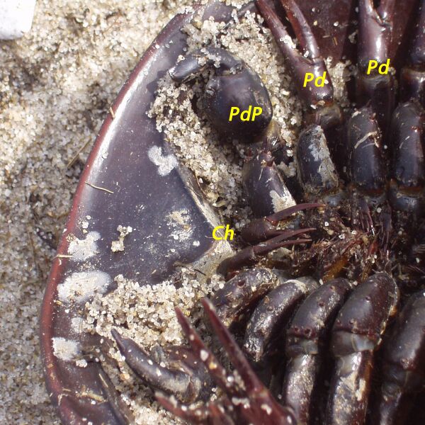 От опистосомы отходит семь пар сильно видоизменённых конечностей. Первый опистосомальный сегмент слит с просомой и несёт пару редуцированных конечностей — хилярий. Конечности второго сегмента преобразованы в широкие пластинчатые структуры — половые крышки. На их задней поверхности расположены парные половые отверстия. Остальные пять пар конечностей представляют собой органы дыхания — жаберные книжки.