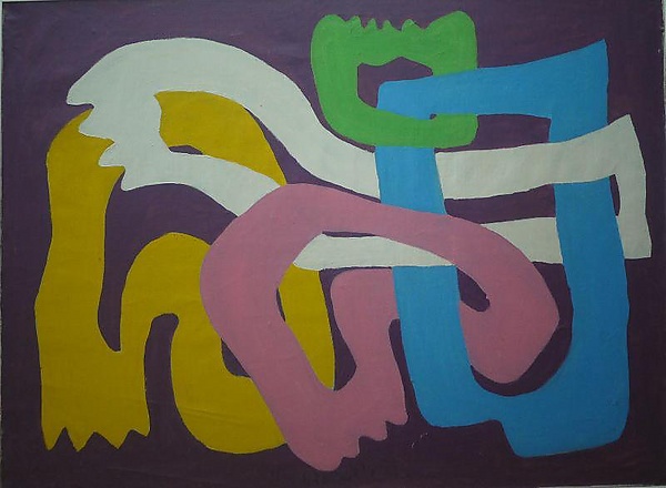 Работа представляет собой абстрактную композицию на сиреневом фоне, выполненную в традициях абстракционизма. На поверхности расположены пять криволинейных лентообразных замкнутых форм с просветами внутри. Одна из форм выделяется зелёным цветом и зубчатыми краями, другая — голубая и имеет форму прямоугольника. Использование сиреневого цвета определяет основную цветовую гамму произведения.