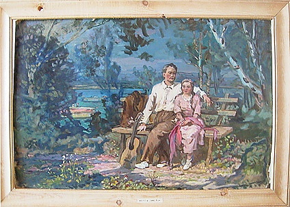 Картина представляет собой двухфигурную композицию на фоне пейзажа. На высоком берегу реки, среди зелёной растительности, на парковой скамейке сидят, прижавшись друг к другу, юноша и девушка. Юноша одет в белую рубашку, светло-коричневые брюки и белую обувь; его правая рука опущена на скамейку рядом с прислонённой гитарой, левая рука лежит на спинке скамьи за плечами девушки. Девушка изображена в розоватом платье с белой отделкой на горловине, в опущенных руках она держит розовый платок, на груди у неё коса. Слева между зеленью видны небольшие суда на реке. Сцена относится к бытовому жанру и передаёт атмосферу уединённого отдыха на природе.