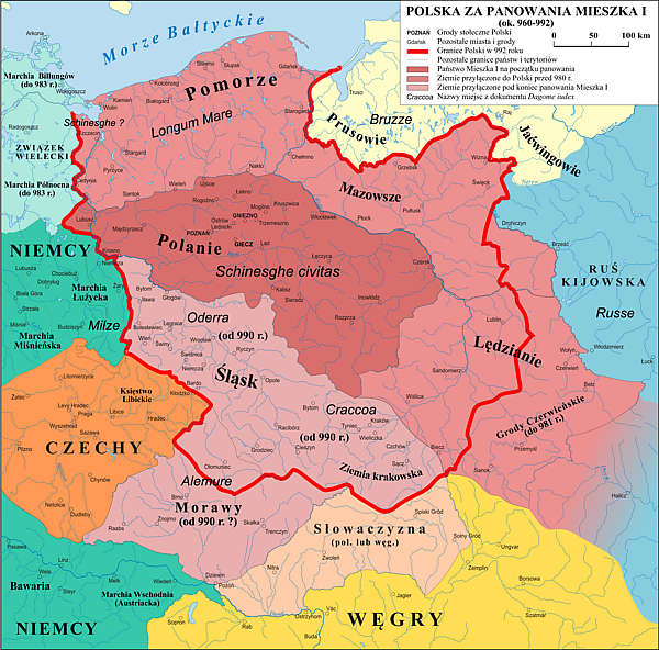 Однако, принятие христианства не обеспечивало прочный мир с другими католиками, так напряженность между маркграфом Саксонской Восточной марки и Польским княжеством за земли между Одером и Вартой вылилось в вооруженное противостояние. Нападение немцев было отражено в результате битвы при Цедене.[6] Победа обеспечила Мешко I возможность расширить свои территории за счет немецких земель Померании, чем он и воспользовался, вызвав недовольство императора Оттона I. Оттон I вынес решение о том, что Мешко I должен был выплатить дань за захваченные территории. Польско-немецкие отношения оставались напряженными. С другой стороны немецкие войска помогали Мешко I справиться с восстанием язычников в прибалтийских землях в 986 году.