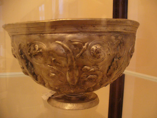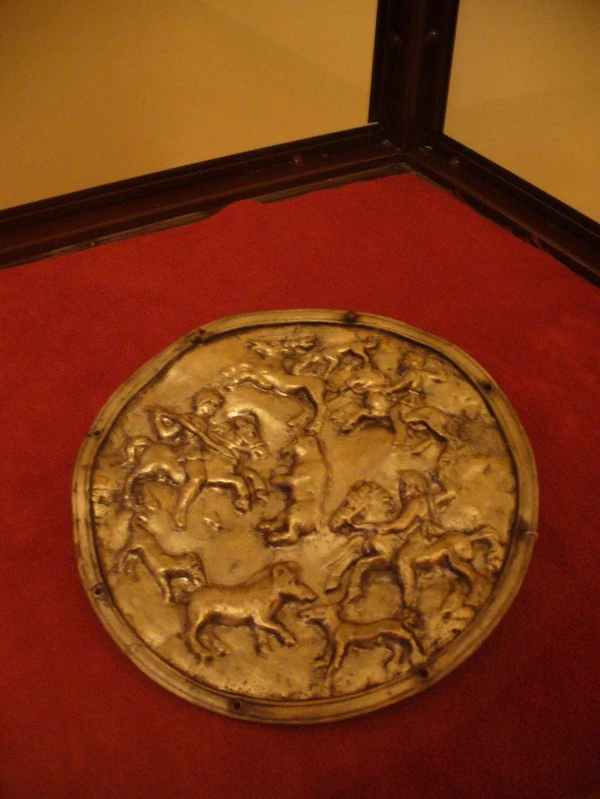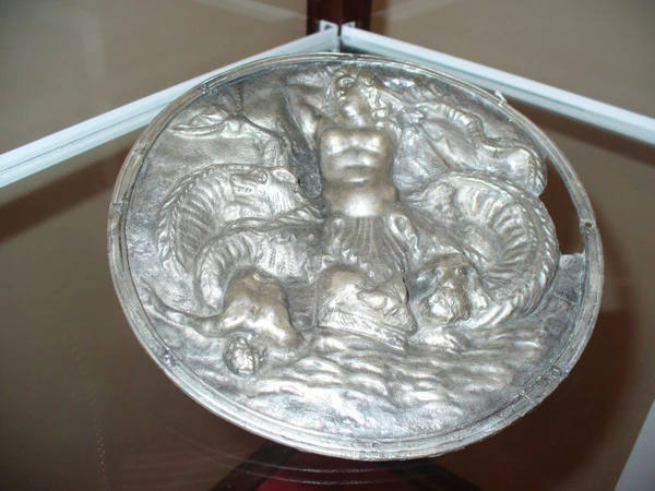 Одним из примечательных предметов является серебряный фалар с изображением женщины-змеи. В круге, ограниченным литым ободком с восемью сквозными отверстиями, на тонкой пластине изображено в верхней части воздушное пространство, в нижней части пластины — морское. На их фоне по центру изображение в фас обнаженного женского тела, с руками, закинутыми за голову с пышными вьющимися волосами, голова влево в профиль. Чуть ниже живота и от бедер из-под трех крупных трилистников вместо ног извивающиеся толстые тела морских змей. В воздушной среде слева и справа от головы женщины они заканчиваются крупными рыбьими хвостовыми плавниками, а в средней части и внизу в морской пучине — морскими собаками, пожирающих обнажённых моряков слева и справа.