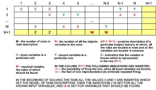 Пусть правил и переменных встречаются в правилах как входные или выходные переменные. Тогда матрица , каждая строка которой соответствует одному правилу и содержит информацию о задействованных переменных, отражает все взаимосвязи между правилами и переменными.