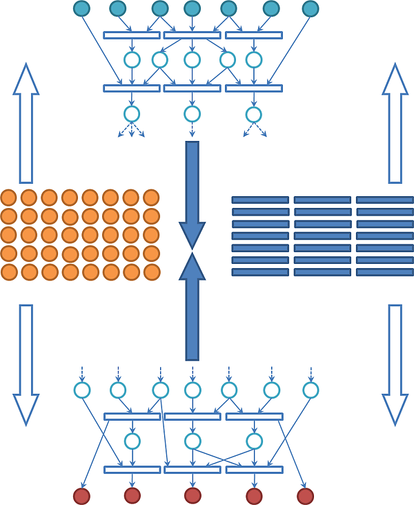 Граф состоит из объектов-переменных и правил-процедур. Сначала формируются два списка, образующих две непересекающиеся доли: список объектов и список правил. Объекты обозначаются кругами. Каждое правило — это обобщение продукционного правила, гиперправило с мультивходами либо вычислительная процедура. Доказывается, что с точки зрения дальнейшей обработки эти формализмы идентичны и представляют собой вершины двудольного графа, обозначаемые прямоугольниками[13].