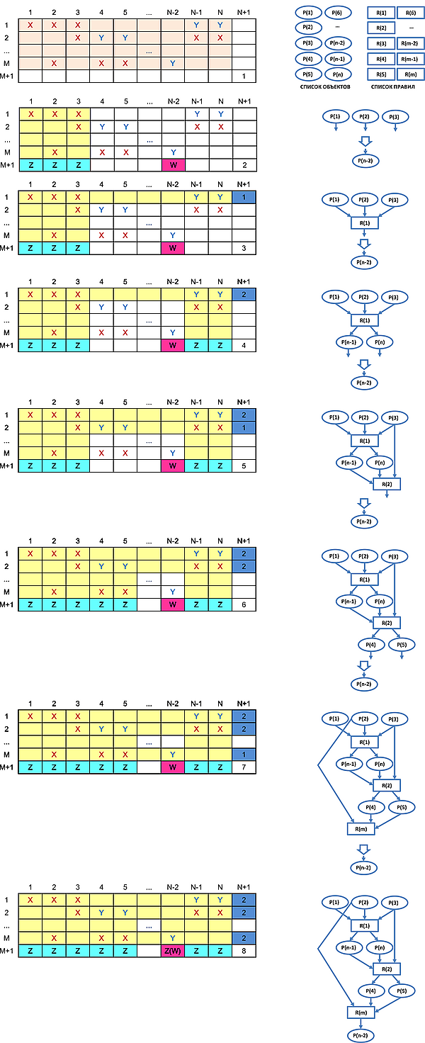 - Симуляция срабатывания (выполнения) правила — присвоение значения «известно» переменным, полученным этим правилом (обозначение ), и дополнительная метка, например, цифра 2. Например, изменения фиксируются в ячейках , и .